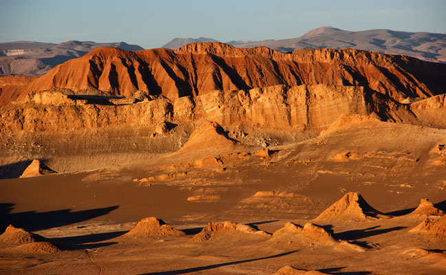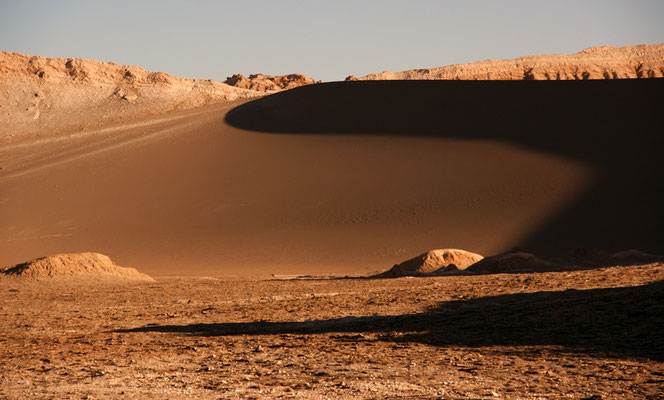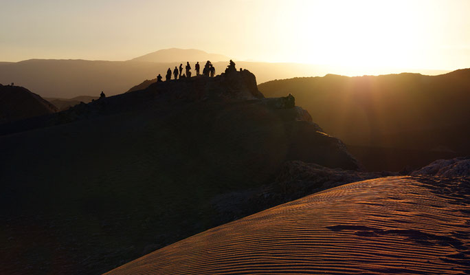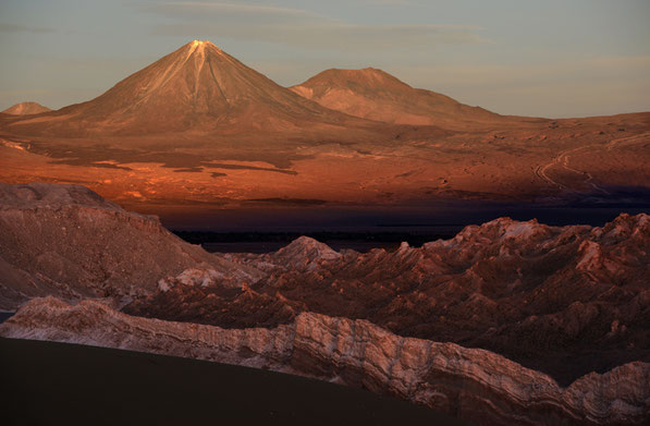 Das Mondtal wird von den Touristen besonders abends besucht, lockt doch der Blick von der höchsten Düne bei Sonnenuntergang auf die sich immer mehr ins Rote verfärbende Westflanke des Vulkans Licancabur.