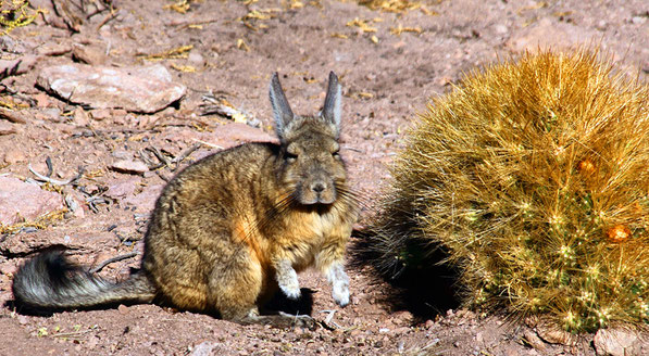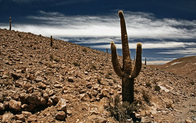 In etwas tieferen Lagen überziehen Kakteen (Echinopsis atacamensis) die steinigen Hänge in einer weitgehend