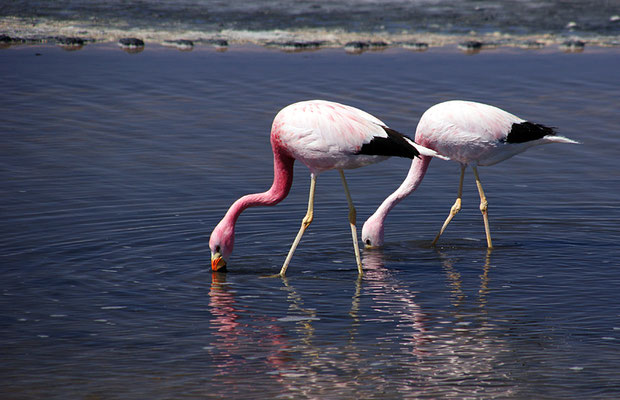 Der zukünftig rapide wachsende Bedarf an Lithium (Batterien in Hybrid- und Elektroautos, Mobiltelefone, Laptops, i-Phones, Akkubohrer) wird eine Ausweitung des auf den südlichen Teil der Lagune konzentrierten Abbaus nach Norden nach sich ziehen und in der Folge das Naturreservat "Los Flamencos" in seiner Existenz bedrohen. Und dieses Reservat in der Laguna Chaxa im nördlichen Teil des Salars hat es in sich; ein Rundweg mit Schautafeln leitet den Besucher und vermittelt einen Eindruck von der Vielfalt des Lebens in dieser menschenfeindlichen Region: Flamingos, Nandus, Gänse, Enten in den feuchten Zonen, Lamas, Guanakos, Vikuñas und Alpakas in den Randgebieten.