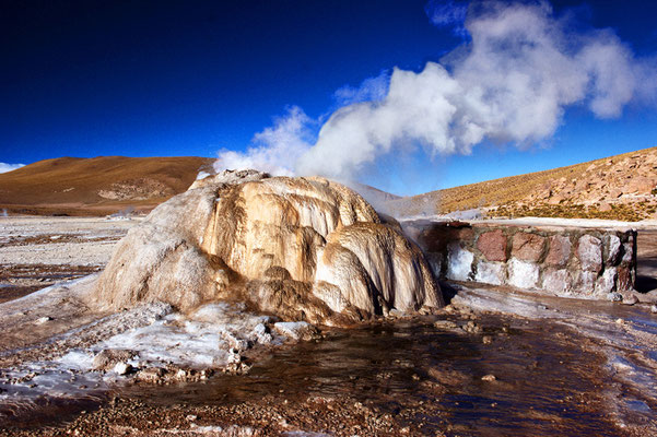 Quellen, Geysire, Schlammvulkane und weitläufige Sinterterrassen, gespeist durch den aktiven Vulkan El Taito (5208 m). In dieser Höhe erreicht das Wasser schon bei 80°C seinen Siedepunkt. Kühlt