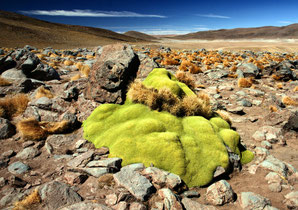 Die Yareta, eine langsam wachsende holzartige Pflanze, gedeiht in Höhen über 4000 Meter und wird von den Atacamenos als Heizmaterial verwendet.