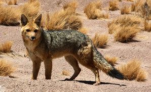 Auf dem Rückweg bringt uns ein Andenfuchs zum Schmunzeln. Selbst als wir anhalten und aussteigen, lässt er sich nicht vertreiben, so, als warte er auf seinen Straßenzoll. Ein Apfel ist vom Picknick übrig und scheint ihm zu schmecken. Er trollt sich, um kurz darauf erneut zu betteln. Mit dieser Masche hat er sicher schon oft Erfolg gehabt.