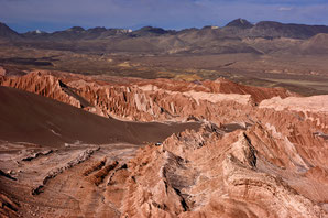 Aus dem tiefen Süden Chiles bringt uns das Flugzeug über Santiago nach Norden in die Atacama. Der Kontrast ist gewaltig: Der Flugplatz Calama liegt in der trockensten Wüste der Welt. Keine Vegetation verhüllt die morphologischen Formen der Landschaft. Kein Grün kaschiert die tristen Arbeitersiedlungen Calamas, in denen die Minenarbeiter der Kupfermine Chuquicamata seit einigen Jahren wohnen, nachdem die Arbeitersiedlung am größten Loch der Welt wegen Staubbelastung aufgegeben worden ist.