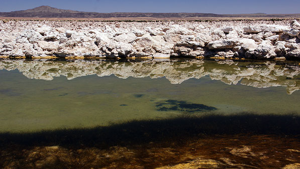 Kurz hinter Toconao zweigt eine Naturstraße ab zum Salar de Atacama. Dieser auf 2300 m Höhe liegende Salzsee mit einer N-S-Ausdehnung von fast 100 km ist mit seinen 3000 Quadratkilometren Fläche der drittgrößte weltweit (nach dem Salar de Uyuni in Bolivien und dem Großen Salzsee in den USA). In ihm liegt einer der größten Bodenschätze Chiles: Lithium. Etwa 40% der gegenwärtigen Weltproduktion stammen von hier. Wasser wird in Becken gepumpt, in denen es verdunstet. Ausgefällt werden die gelösten Salze, die konzentrierte Sole mit dem wertvollen Lithium wird in Tankwagen nach Antofagasta zur weiteren Verarbeitung und zum Export transportiert.